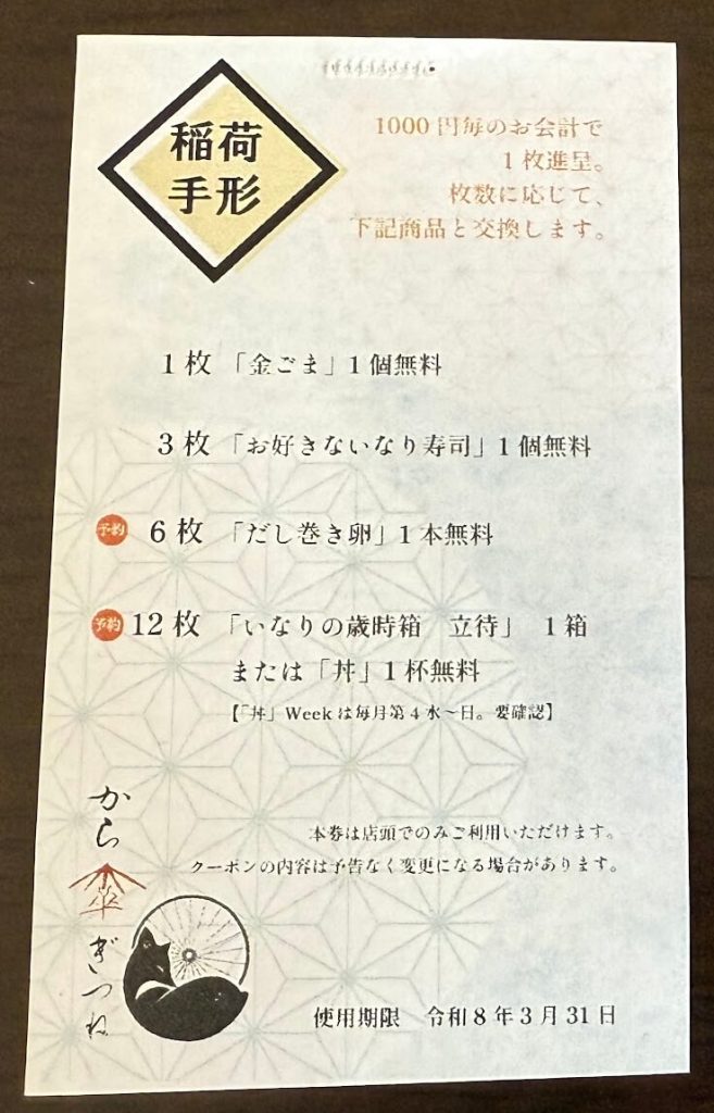 通常お買い上げ1,000円ごとに1枚もらえる「稲荷手形」。