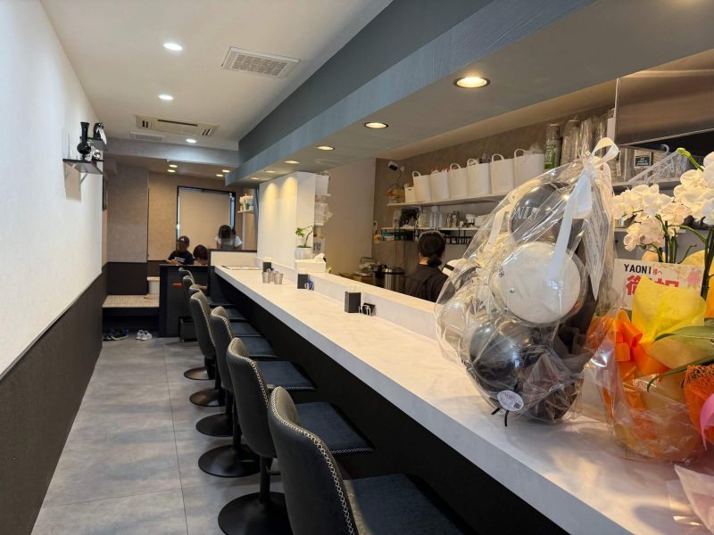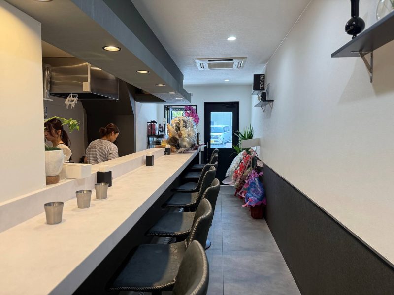 店内はカウンター席のみで、白と黒で色味を抑えたスタイリッシュな雰囲気。