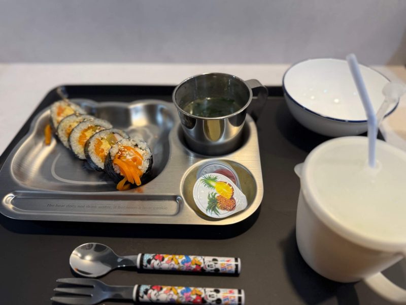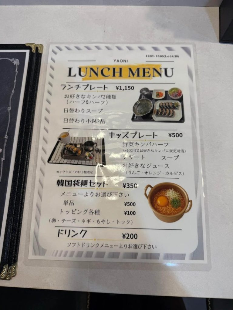キッズプレートは500円と良心的な価格設定。野菜キンパハーフにスープとデザート、ドリンク付きです。プラス100円でお好きなキンパへ変更可能です。
